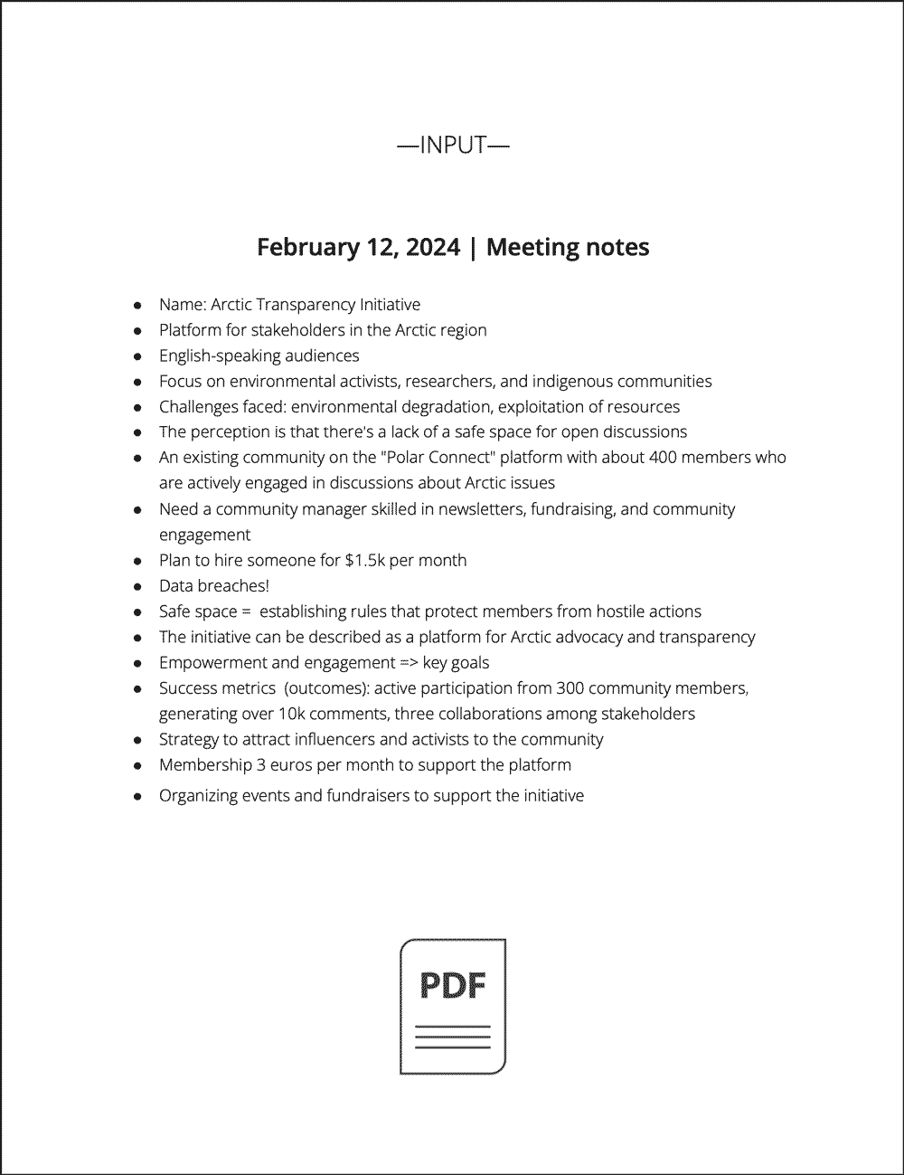 We're including user's initial input as a set of meeting notes, followed by the outcomes, generated by Elgranto Ai-Assistant for both - project description and a budget estimation.